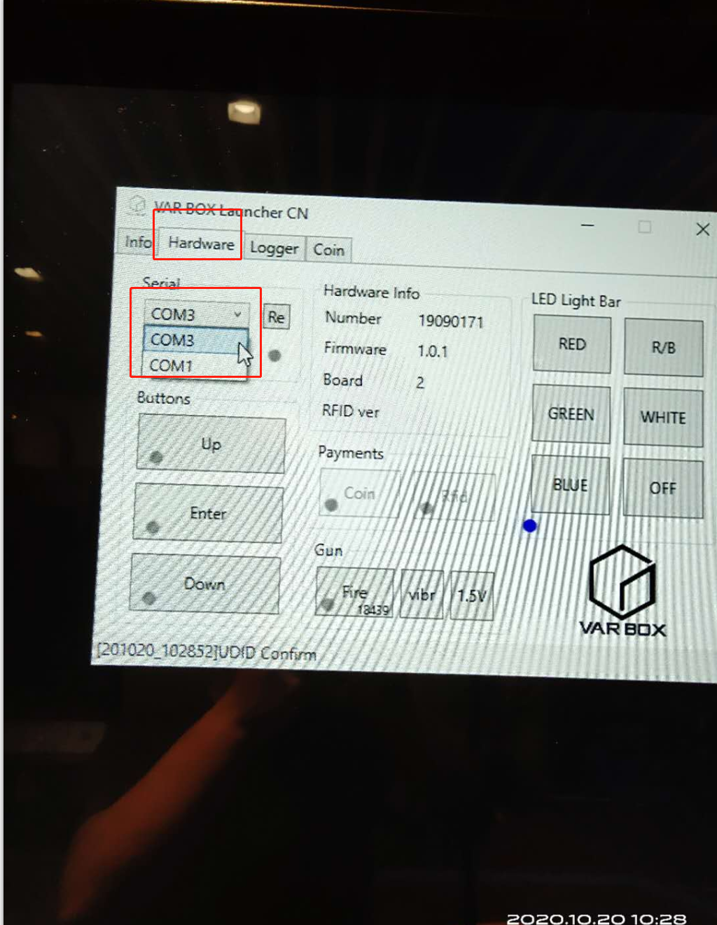 先查看屏幕右下角是否正常显示机器号,未正常显示切换到游戏面板,选择Hardware——选择COM3;如图: