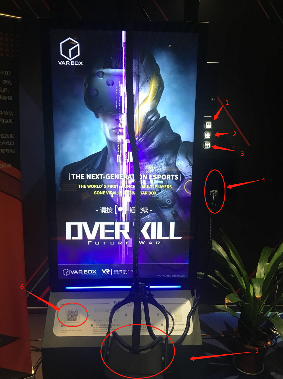 使用指南 1:按一下调整整容,长按返回上一步; 2:单击确认键,长按开始比赛; 3:按一下调整阵容; 4:手枪; 5:头显; 6:公众号二维码; 组合键1+2:退出正在进行的游戏。 点击2号键弹出机器对应的二维码 视频演示: 步骤描述: 打开手机微信——扫描机器下方二维码——关注公众号——点击扫描开战——点击小程序中扫码——点击机器右侧圆形2号键——扫描屏幕二维码——选择游戏类型——支付完成——戴头显,拿上武器开始战斗吧!!!